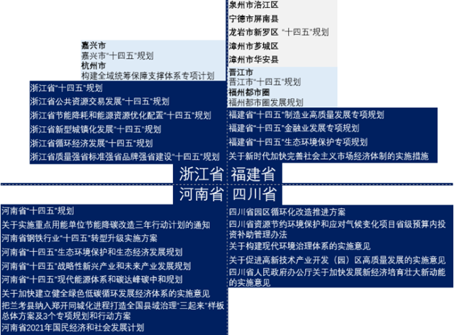 除試點(diǎn)四省外,全國(guó)其余省與自治區(qū)均積極響應(yīng)全國(guó)“十四五”規(guī)劃對(duì)用能權(quán)市場(chǎng)建設(shè)的要求。如下圖所示,我國(guó)大陸所有省份均在省級(jí)規(guī)劃中將用能權(quán)市場(chǎng)列入,在省級(jí)層面對(duì)用能權(quán)市場(chǎng)建設(shè)提供支持,多市在市級(jí)層面出臺(tái)政策與規(guī)劃,進(jìn)一步提高對(duì)用能權(quán)市場(chǎng)建設(shè)的支持力度。有關(guān)政策覆蓋生態(tài)環(huán)境保護(hù)、高碳行業(yè)低碳改造、產(chǎn)業(yè)轉(zhuǎn)型升級(jí)、金融、環(huán)境權(quán)益交易市場(chǎng)協(xié)調(diào)建設(shè)等多個(gè)領(lǐng)域,為我國(guó)建設(shè)全國(guó)用能權(quán)交易市場(chǎng)以通過市場(chǎng)化手段促進(jìn)產(chǎn)業(yè)提效轉(zhuǎn)型、推動(dòng)綠色發(fā)展具有顯著促進(jìn)作用。