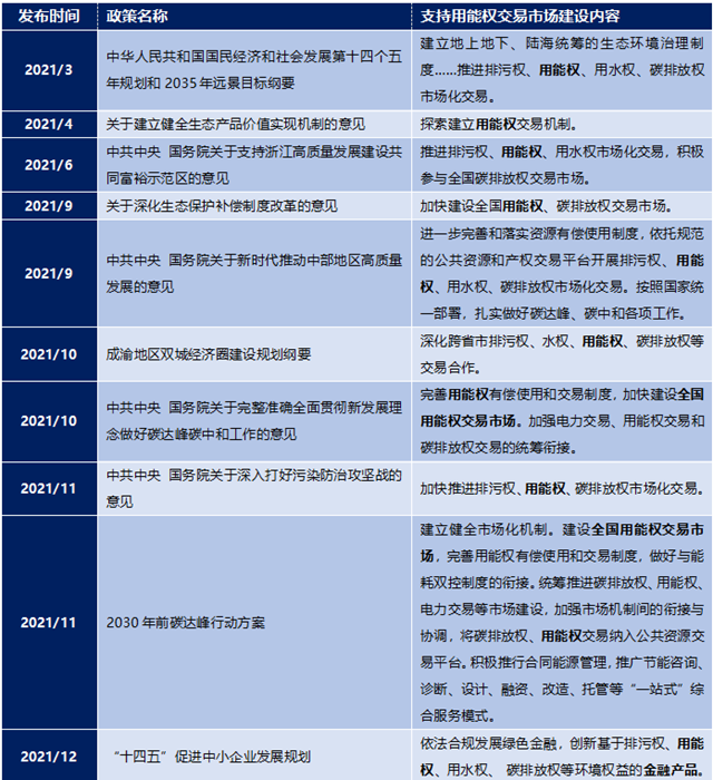 除《意見》外,2021年全年國(guó)家層面陸續(xù)發(fā)布多項(xiàng)政策,明確用能權(quán)交易機(jī)制建設(shè)在生態(tài)文明建設(shè)、碳達(dá)峰碳中和目標(biāo)、生態(tài)環(huán)境治理、綠色金融、小微企業(yè)支持及推動(dòng)我國(guó)中部地區(qū)和成渝雙城經(jīng)濟(jì)圈等局部地區(qū)高質(zhì)量發(fā)展過程中的重要地位。