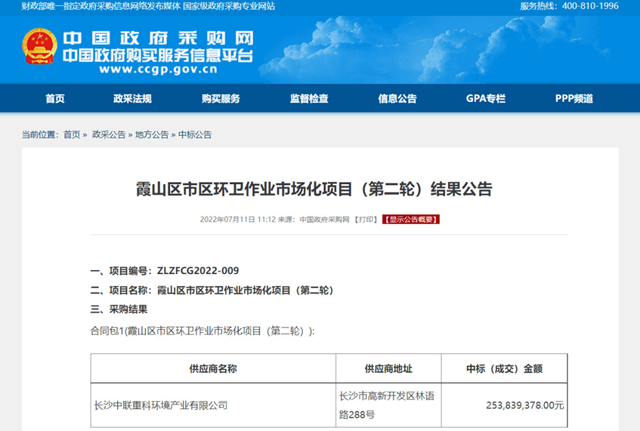 經(jīng)歷了去年的短暫下滑之后,盈峰環(huán)境在2022年上半年迎來爆發(fā)。7月11日,中國(guó)政府采購(gòu)網(wǎng)發(fā)布廣東省湛江市霞山區(qū)市區(qū)環(huán)衛(wèi)作業(yè)市場(chǎng)化項(xiàng)目(第二輪)結(jié)果公告,長(zhǎng)沙中聯(lián)重科環(huán)境產(chǎn)業(yè)有限公司中標(biāo),中標(biāo)金額2.53839378億元,項(xiàng)目服務(wù)期為3年。