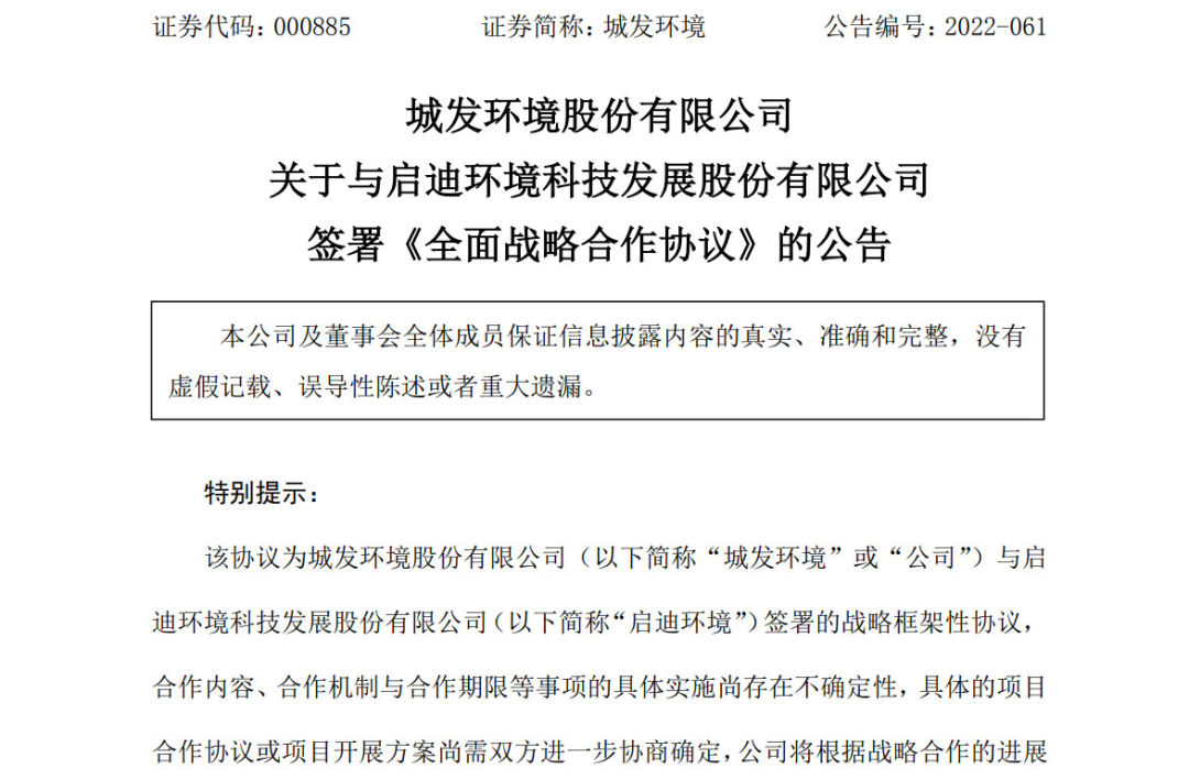 同一天,城發(fā)環(huán)境還發(fā)布了第二則公告,名稱是《關(guān)于與啟迪環(huán)境科技發(fā)展股份有限公司簽署<全面戰(zhàn)略合作協(xié)議>的公告》。