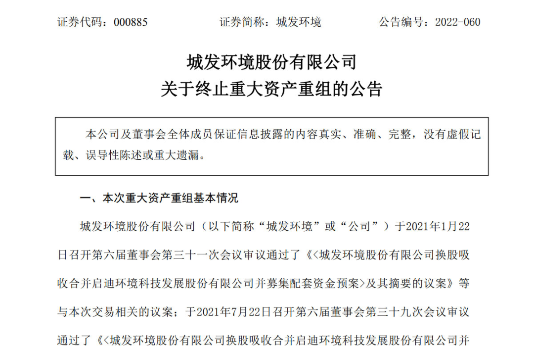 1、城發(fā)環(huán)境:關(guān)于終止重大資產(chǎn)重組的公告,城發(fā)環(huán)境,2022-07-21