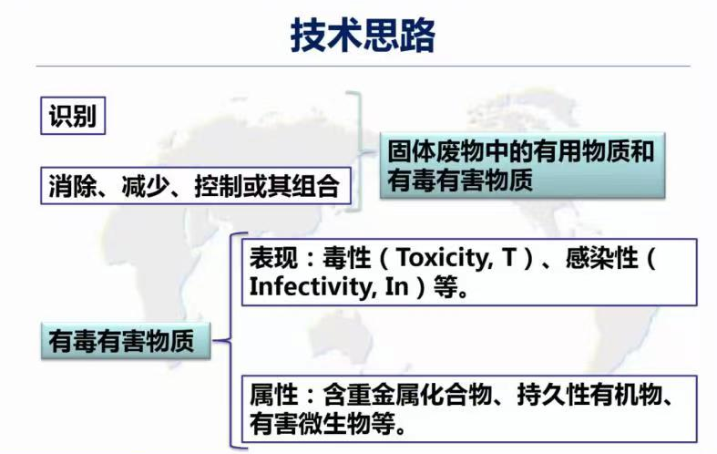 固廢管理的技術(shù)思路分為兩類,一方面應(yīng)識別固廢中的有用物質(zhì)對其進(jìn)行資源化利用;而另一方面對表現(xiàn)出毒性、感染性等含重金屬化合物、持久性有機(jī)物和有害微生物等有毒有害物質(zhì)需著力消除、減少、控制或使用組合措施。廢物處理中通常需要加入能量與化學(xué)物質(zhì),在轉(zhuǎn)化得到產(chǎn)品的同時可能產(chǎn)生大氣排放、水體排放與工藝殘余物,需要關(guān)注與控制。