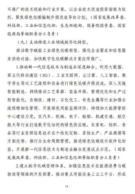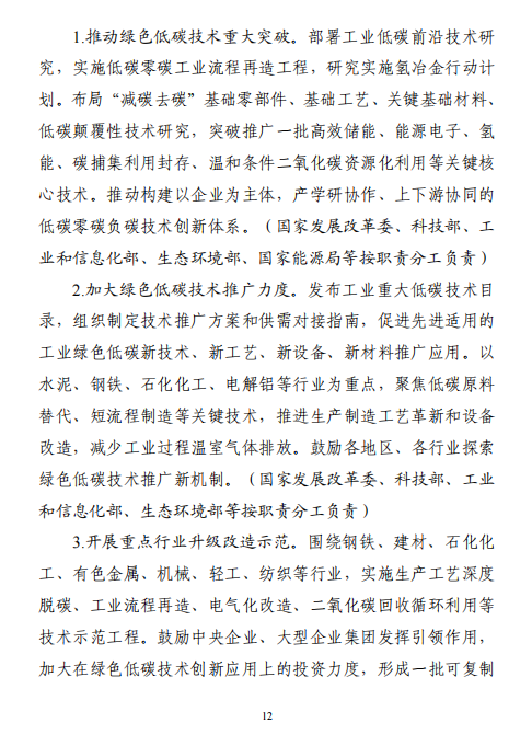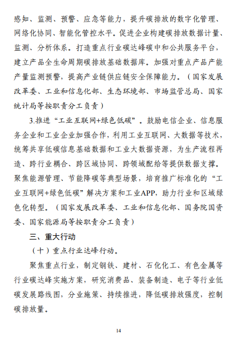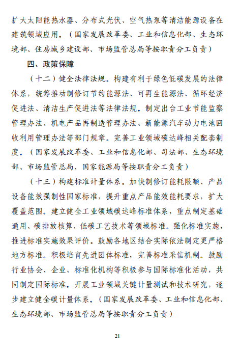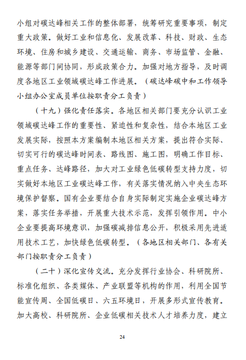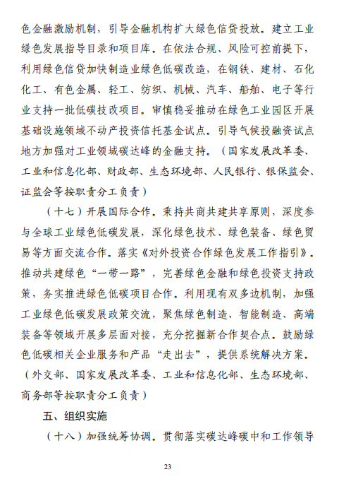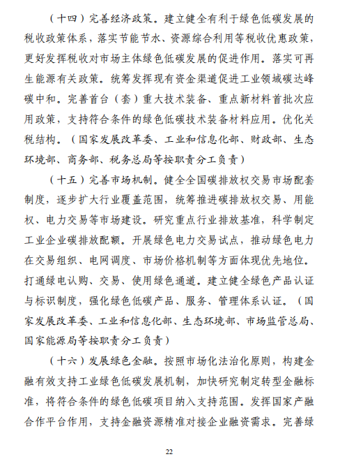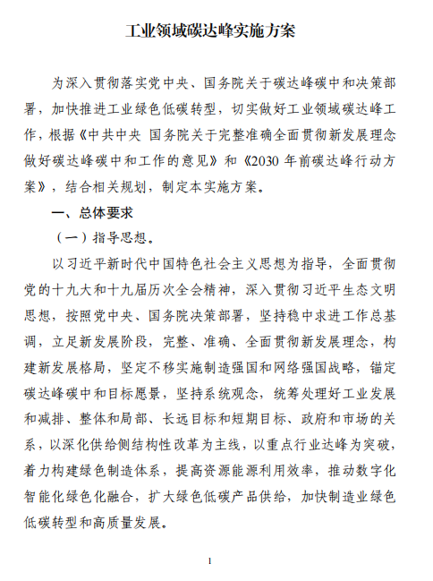 工業(yè)和信息化部 國家發(fā)展改革委 生態(tài)環(huán)境部關于印發(fā)工業(yè)領域碳達峰實施方案的通知工信部聯(lián)節(jié)〔2022〕88號外交部、科技部、司法部、財政部、住房城鄉(xiāng)建設部、交通運輸部、商務部、人民銀行、國資委、稅務總局、市場監(jiān)管總局、統(tǒng)計局、銀保監(jiān)會、證監(jiān)會、能源局、林草局、郵政局,各省、自治區(qū)、直轄市及計劃單列市、新疆生產(chǎn)建設兵團工業(yè)和信息化主管部門、發(fā)展改革委、生態(tài)環(huán)境廳(局):《工業(yè)領域碳達峰實施方案》已經(jīng)碳達峰碳中和工作領導小組審議通過,現(xiàn)印發(fā)給你們,請認真貫徹落實。