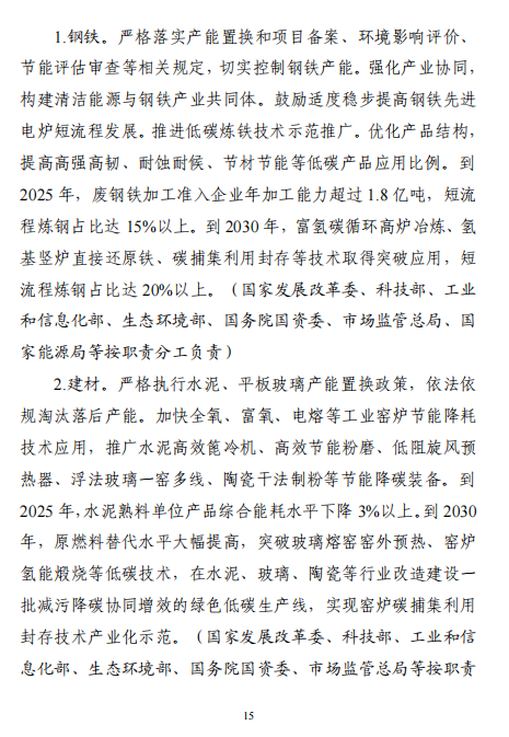 “十五五”期間,產(chǎn)業(yè)結構布局進一步優(yōu)化,工業(yè)能耗強度、二氧化碳排放強度持續(xù)下降,努力達峰削峰,在實現(xiàn)工業(yè)領域碳達峰的基礎上強化碳中和能力,基本建立以高效、綠色、循環(huán)、低碳為重要特征的現(xiàn)代工業(yè)體系。確保工業(yè)領域二氧化碳排放在2030年前達峰。方案指出,加強再生資源循環(huán)利用。實施廢鋼鐵、廢有色金屬、廢紙、廢塑料、廢舊輪胎等再生資源回收利用行業(yè)規(guī)范管理,鼓勵符合規(guī)范條件的企業(yè)公布碳足跡。延伸再生資源精深加工產(chǎn)業(yè)鏈條,促進鋼鐵、銅、鋁、鉛、鋅、鎳、鈷、鋰、鎢等高效再生循環(huán)利用。研究退役光伏組件、廢棄風電葉片等資源化利用的技術路線和實施路徑。圍繞電器電子、汽車等產(chǎn)品,推行生產(chǎn)者責任延伸制度。推動新能源汽車動力電池回收利用體系建設。