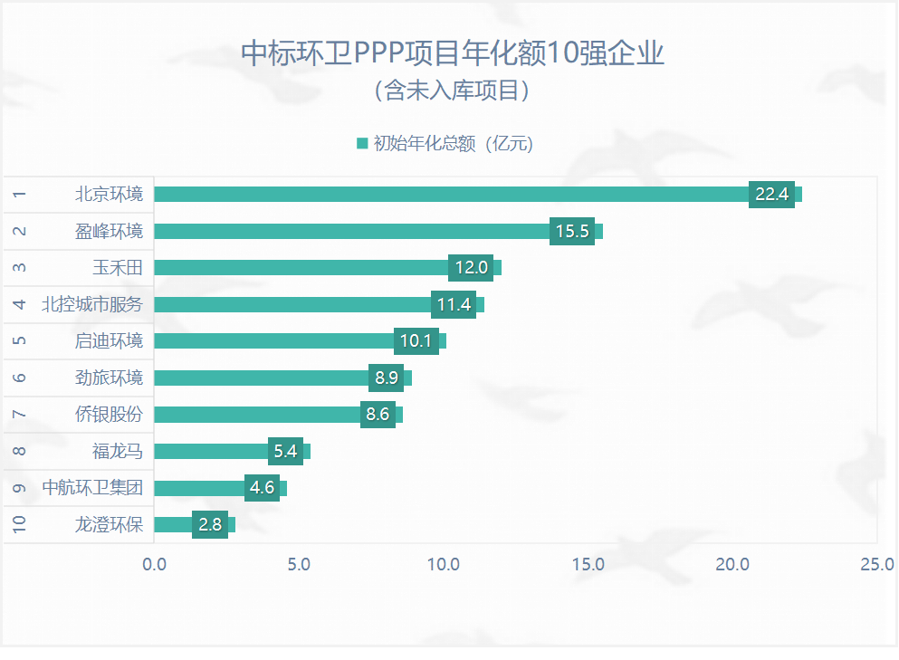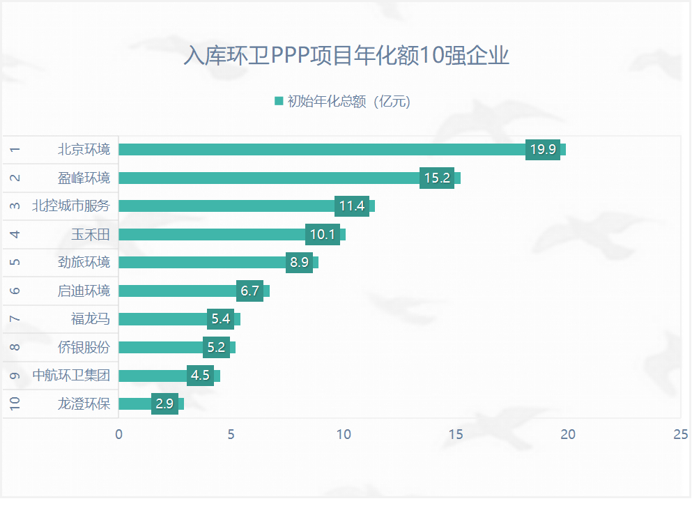 在302個(gè)入庫且已開標(biāo)環(huán)衛(wèi)PPP項(xiàng)目中,北京環(huán)境入庫項(xiàng)目年化總額接近20億元(按初始年化額計(jì)算),排名第一,占全部已入庫且已開標(biāo)環(huán)衛(wèi)PPP項(xiàng)目年化總額的13%。
