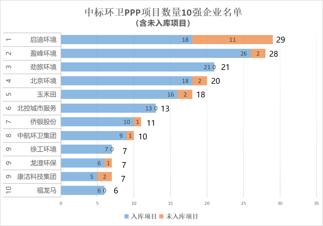 在337個(gè)已開標(biāo)環(huán)衛(wèi)PPP項(xiàng)目中,啟迪環(huán)境已中標(biāo)環(huán)衛(wèi)PPP項(xiàng)目數(shù)量多達(dá)29個(gè),排名第一,占全部已已開標(biāo)環(huán)衛(wèi)PPP項(xiàng)目總量的8.6%。
