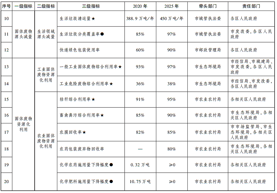1.實(shí)現(xiàn)生活垃圾分類基本全覆蓋。實(shí)施“大分流、細(xì)分類”,在具備條件的小區(qū)推行定時(shí)定點(diǎn)分類投放。創(chuàng)建生活垃圾分類示范單位260個(gè)、示范小區(qū)400個(gè)、示范村280個(gè)。推動(dòng)生活垃圾分類收運(yùn)與再生資源回收“兩網(wǎng)融合”,推進(jìn)廚余垃圾源頭減量。到2025年,生活垃圾分類覆蓋率達(dá)到97%、回收利用率達(dá)到38%。(責(zé)任單位:市城管執(zhí)法委、市發(fā)改委、市商務(wù)局,市供銷社,各區(qū)人民政府)
