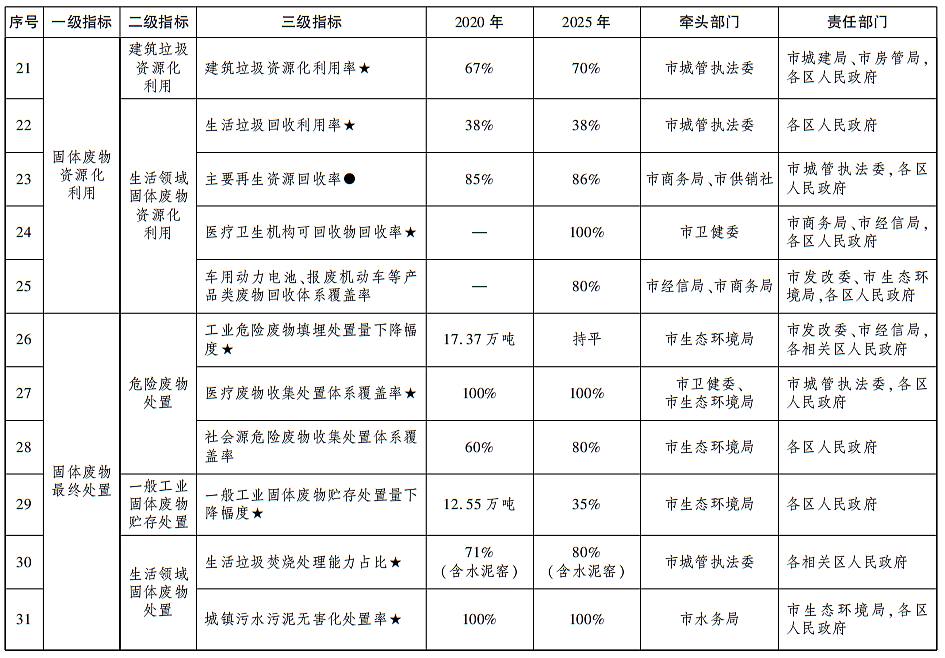 “無(wú)廢城市”是以創(chuàng)新、協(xié)調(diào)、綠色、開放、共享的新發(fā)展理念為引領(lǐng),通過推動(dòng)形成綠色發(fā)展方式和生活方式,強(qiáng)化固體廢物源頭減量,提升廢棄物資源綜合循環(huán)利用水平,有效保障無(wú)害化處置能力,最大限度降低固體廢物填埋量,是一種先進(jìn)的城市管理理念。具體建設(shè)目標(biāo)是:到2025年,全市工業(yè)固體廢物產(chǎn)生強(qiáng)度較快下降,主要農(nóng)業(yè)廢棄物接近全量利用,生活垃圾分類基本實(shí)現(xiàn)全覆蓋,建筑垃圾綜合利用水平顯著提升,危險(xiǎn)廢物得到安全管控,固體廢物管理信息“一張網(wǎng)”初步建成,以汽車、鋼鐵、石化、建材、食品等為主導(dǎo)的產(chǎn)業(yè)“無(wú)廢”模式初步形成,“無(wú)廢”理念深入人心。