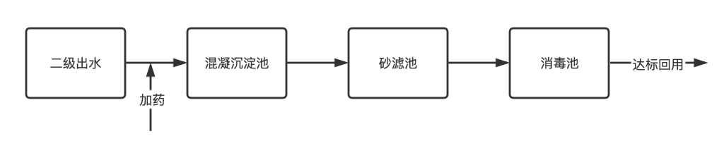 污水廠二級出水通過投加絮凝劑,經(jīng)混凝、絮凝后,水體中剩余微小顆粒和膠態(tài)物質(zhì)凝聚成較大絮凝體,繼而在沉淀池進(jìn)行沉淀,再通過濾池的過濾作用得以去除。過濾后的水被送入消毒池,用臭氧或氯等消毒,殺滅細(xì)菌和病毒,然后將達(dá)標(biāo)的處理水送入中水道回用。