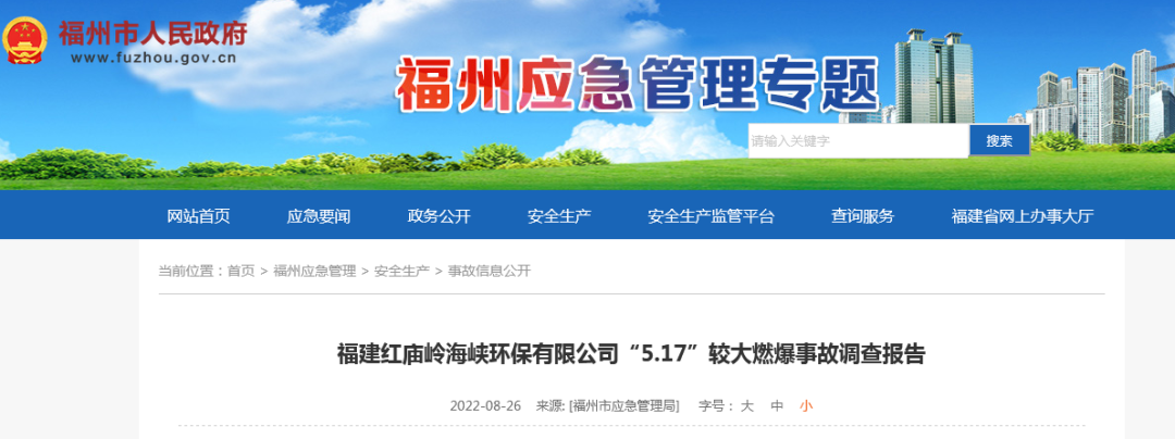 2022年5月17日上午8時(shí)54分,福建紅廟嶺海峽環(huán)保有限公司10萬方調(diào)節(jié)池上方外包作業(yè)人員違規(guī)用氬弧焊對除臭設(shè)施風(fēng)管漏點(diǎn)進(jìn)行焊接施工時(shí)發(fā)生燃爆,造成3人死亡,3人受傷,5#、6#池頂蓋坍塌,池頂除臭裝置損壞,直接經(jīng)濟(jì)損失約1800萬元。事故發(fā)生后,尹力書記、趙龍省長、郭寧寧常務(wù)副省長、林文斌副省長等領(lǐng)導(dǎo)第一時(shí)間做出重要批示,要求全力搜救失聯(lián)人員,全力搶救受傷人員;嚴(yán)格救援現(xiàn)場管控,防止發(fā)生次生災(zāi)害;查明原因,舉一反三,排查隱患,防范類似事故發(fā)生;做好善后工作。省委常委、市委林寶金書記、省應(yīng)急廳伍斌廳長、吳賢德市長、省建設(shè)廳王明炫副廳長等領(lǐng)導(dǎo)到場指導(dǎo)應(yīng)急救援。省消防救援總隊(duì)高寧宇總隊(duì)長、蘇作琴副總隊(duì)長率領(lǐng)總隊(duì)全勤指揮部到場指揮救援行動。林中麟常務(wù)副市長全時(shí)指揮市應(yīng)急局、市消防救援支隊(duì)、市城管委、市衛(wèi)健委、市公安局、晉安區(qū)委區(qū)政府及多支民間救援隊(duì)進(jìn)行現(xiàn)場救援。根據(jù)《生產(chǎn)安全事故報(bào)告和調(diào)查處理?xiàng)l例》(國務(wù)院令第493號),經(jīng)市政府授權(quán),市應(yīng)急管理局牽頭市城管委、市公安局、市總工會、晉安區(qū)政府成立市政府福建紅廟嶺海峽環(huán)保有限公司“5.17”燃爆較大事故調(diào)查組(以下簡稱事故調(diào)查組),聘請3名專家參與調(diào)查,并邀請市紀(jì)委監(jiān)委派員參加。事故調(diào)查組按照“四不放過”和“科學(xué)嚴(yán)謹(jǐn)、依法依規(guī)、實(shí)事求是、注重實(shí)效”的原則,通過現(xiàn)場勘查、技術(shù)鑒定、調(diào)查取證、專家論證、人員問詢、調(diào)閱資料、問題核實(shí)和綜合分析,查明了事故發(fā)生的經(jīng)過、原因、應(yīng)急救援、人員傷亡情況和直接經(jīng)濟(jì)損失,認(rèn)定了事故性質(zhì)和責(zé)任,提出了對相關(guān)責(zé)任人員及責(zé)任單位的處理建議及防范整改措施建議。(一)福建紅廟嶺海峽環(huán)保有限公司。成立于2014年02月21日,注冊資本為500萬人民幣,法定代表人為徐國丹,經(jīng)營狀態(tài)為存續(xù),工商注冊號為350100100368616,注冊地址為福州市晉安區(qū)鼓山鎮(zhèn)洋里路16號綜合樓一樓107室,經(jīng)營范圍包括城市污水處理及其再生利用;垃圾滲瀝液收集及處理、環(huán)境污染治理設(shè)施的投資、建設(shè)、運(yùn)營;城市餐廚垃圾處理;環(huán)境污染治理設(shè)施運(yùn)營咨詢服務(wù)及技術(shù)服務(wù)(依法須經(jīng)批準(zhǔn)的項(xiàng)目,經(jīng)相關(guān)部門批準(zhǔn)后方可開展經(jīng)營活動)。為福建海峽環(huán)保集團(tuán)股份有限公司獨(dú)立法人的全資子公司,10萬方新調(diào)節(jié)池項(xiàng)目的實(shí)際管理單位。(二)福建致辰宇洋環(huán)??萍加邢薰?。成立于2015年3月12日,注冊資本為1000萬人民幣,法定代表人為俞果,經(jīng)營狀態(tài)為存續(xù),工商注冊號為350100100432860,注冊地址為福州市晉安區(qū)新店鎮(zhèn)秀山路245號索高廣場4#樓1層101單元,經(jīng)營范圍包括一般項(xiàng)目:大氣污染治理;水污染治理;生態(tài)環(huán)境監(jiān)測及檢測儀器儀表銷售;大氣污染監(jiān)測及檢測儀器儀表銷售;海洋水質(zhì)與生態(tài)環(huán)境監(jiān)測儀器設(shè)備銷售;環(huán)境保護(hù)監(jiān)測;水質(zhì)污染物監(jiān)測及檢測儀器儀表銷售等(除依法須經(jīng)批準(zhǔn)的項(xiàng)目外,憑營業(yè)執(zhí)照依法自主開展經(jīng)營活動)。受福建紅廟嶺海峽環(huán)保有限公司委托對10萬方新調(diào)節(jié)池進(jìn)行除臭設(shè)施提升。(三)福建省偉邦市政環(huán)保工程設(shè)計(jì)研究院有限公司,成立于2006-04-26,注冊資本為300萬人民幣,法定代表人為劉建偉,經(jīng)營狀態(tài)為開業(yè),工商注冊號為350100100173044,注冊地址為福州市鼓樓區(qū)工業(yè)路611號福建高新技術(shù)創(chuàng)業(yè)園主樓4層北6房,經(jīng)營范圍包括市政、環(huán)保工程技術(shù)咨詢、設(shè)計(jì),市政、環(huán)保設(shè)備儀器儀表研發(fā)、推廣、銷售,環(huán)保生物廢水處理劑的研發(fā)、推廣、銷售,市政環(huán)保工程承包建設(shè)。(依法須經(jīng)批準(zhǔn)的項(xiàng)目,經(jīng)相關(guān)部門批準(zhǔn)后方可開展經(jīng)營活動)。該公司投資入股福建致辰宇洋環(huán)??萍加邢薰境袛埖?0萬方新調(diào)節(jié)池的除臭設(shè)施提升項(xiàng)目;受福建致辰宇洋環(huán)??萍加邢薰镜姆ㄈ舜碛峁?,該公司工程師陳連文負(fù)責(zé)10萬方新調(diào)節(jié)池的除臭設(shè)施提升項(xiàng)目具體管理。(四)福州嘉鑫華強(qiáng)金屬制品有限公司。成立于2018-06-15,注冊資本為200萬人民幣,法定代表人為羅維嘉,經(jīng)營狀態(tài)為存續(xù),工商注冊號為350121100236032,注冊地址為福建省福州市閩侯縣祥謙鎮(zhèn)林森大道28號,經(jīng)營范圍包括金屬制品、工藝品、建筑材料、家具的加工;家具、文體用品、日用百貨、五金交電的銷售及通過互聯(lián)網(wǎng)銷售。(依法須經(jīng)批準(zhǔn)的項(xiàng)目,經(jīng)相關(guān)部門批準(zhǔn)后方可開展經(jīng)營活動)。陳連文