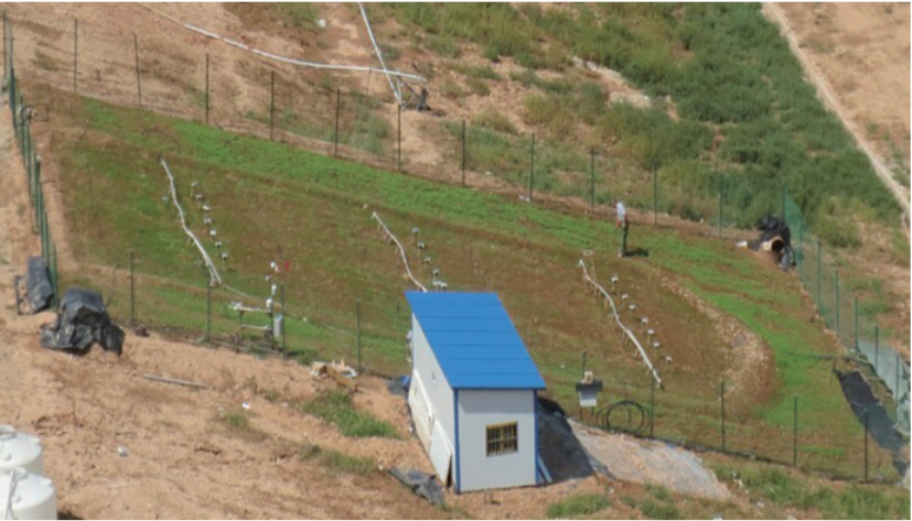 香港科技大學(xué)吳宏偉教授團(tuán)隊(duì)于2016 年在深圳下坪生活垃圾填埋場(chǎng)二期西段建設(shè)了全天候3層覆蓋層試驗(yàn)區(qū),如圖9所示,其中一半覆蓋層試驗(yàn)區(qū)種植百慕大草,另一半作為參照組,坡面不種植任何植物,并由無(wú)紡?fù)凉げ几采w,以防止降雨期間地表侵蝕。該覆蓋層坡度為30°,經(jīng)受深圳數(shù)次強(qiáng)臺(tái)風(fēng)暴雨依然穩(wěn)定,有效提升了填埋場(chǎng)庫(kù)容。為驗(yàn)證3層土質(zhì)覆蓋層的防滲性能,對(duì)覆蓋層試驗(yàn)場(chǎng)進(jìn)行了長(zhǎng)達(dá)54個(gè)月的監(jiān)測(cè),包括降雨量、覆蓋層滲漏量、孔隙水壓力及含水量變化等?,F(xiàn)場(chǎng)監(jiān)測(cè)數(shù)據(jù)表明,無(wú)膜的全天候3層覆蓋層在濕潤(rùn)區(qū)年均滲漏量低于北美濕潤(rùn)區(qū)覆蓋層設(shè)計(jì)標(biāo)準(zhǔn)。