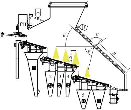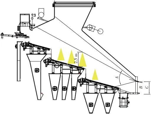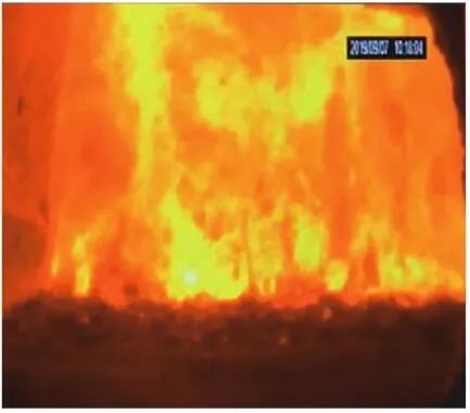 當前生活垃圾焚燒爐廣泛采用的爐膛火焰監(jiān)視系統(tǒng)基本上都是由早期應用在水泥廠、鋼鐵廠的加熱爐、退火爐和氧化鋁廠等行業(yè)內(nèi)的高溫看火工業(yè)電視演變升級而來。內(nèi)窺式數(shù)字高清爐膛火焰監(jiān)視系統(tǒng)成像裝置主要由耐高溫針孔電動鏡頭、寶石物鏡、光學濾光片、光圈焦距調(diào)節(jié)器等組成,配有電控推進器、氣源控制柜、光端機等輔助設備。其核心問題是如何在生活垃圾焚燒爐的高溫、多塵、強腐蝕環(huán)境中長周期穩(wěn)定運行,保證火焰畫面不丟包、不失真。1)優(yōu)勢特性分析。一是技術成熟、運行穩(wěn)定。隨著我國近一二十年間生活垃圾發(fā)電廠的興建,爐膛火焰監(jiān)視系統(tǒng)的技術也處于不停地優(yōu)化和迭代之中,目前已能滿足穩(wěn)定、可靠的要求。其中常規(guī)配置參數(shù)為攝像頭300 萬像素,響應時間2 s,光圈(F數(shù))1.6,焦距2.4 mm。二是工作環(huán)境好。爐膛火焰監(jiān)視器探頭通常安裝于焚燒爐后墻,所處位置是垃圾燃燒最末端,常規(guī)工況下探頭周圍煙氣溫度通常<600 ℃。較之焚燒爐其他高溫環(huán)境已算“宜居地帶”。三是維護量小。焚燒爐后墻幾乎沒有結焦現(xiàn)象,常規(guī)爐膛火焰監(jiān)視探頭開孔位置僅存有因爐膛偶爾正壓時煙氣外冒造成的積灰,積灰量不大,清理工作較為輕松。2)劣勢特性分析。一是參數(shù)單一。因垃圾焚燒行業(yè)爐型構造和燃燒成分的特殊性,垃圾焚燒爐長期采用的火焰探頭利用的是光學成像原理,運行人員僅能通過觀察火焰形狀和位置來判斷焚燒爐工況,無法得到多維度參數(shù)。二是視角局限。爐膛火焰探頭通常位于焚燒爐后墻,安裝角度朝向爐內(nèi)成斜向上方向,與水平線夾角15°左右,探頭視場角通常>60°。以某大型列動順推爐排焚燒爐為例,在此仰視角度下可以看到爐排燃燒段尾部、燃燼段前部兩面明顯的火焰幕墻,由于火焰鋒面遮擋,很難觀察到燃燒段中前部的火焰狀況。 以某單臺750 t/d大型列動順推爐排焚燒爐中爐膛火焰監(jiān)視器安裝位置和顯示畫面為實例,具體分析火焰成像狀態(tài)。其實際火焰成像畫面見圖1。成像角度是由焚燒爐后墻探頭位置向上仰視爐膛。因焚燒工況十分良好,靠近后墻的燃燼段區(qū)域幾乎沒有明火,燃燒段尾部成一面豎直、光亮的黃紅色火焰鋒面,高度約為2.5 m。對應的爐膛火焰監(jiān)視器安裝示意如圖2所示。爐膛火焰探頭安裝在焚燒爐后墻,安裝位置與后墻觀火平臺地面距離為C(m)。開孔傾角與水平方向夾角為B(°),有效視場角為A(°)。圖2中由黃色填充的三角形區(qū)域代表正常燃燒火焰,其中標注高度2.5 m的區(qū)域為燃燒爐排尾部火焰,即為圖1所顯示的火焰鋒面。顯然,從爐膛火焰監(jiān)視器向上望去,燃燒段前部、中部火焰為視野盲區(qū)。由于被燃燒段尾部火焰鋒面遮擋,通過火焰監(jiān)視器通常只能看到燃燒段尾部、燃燼段前部這兩個區(qū)域的火焰。