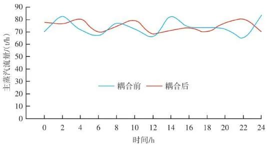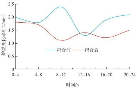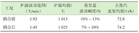 根據(jù)工藝設計和焚燒爐結構,從燃燒段至燃燼段前部為垃圾的燃燒區(qū)域,爐排底部依次有4行風室,即圖7中所示2、3、4和5行風室,每行各有3列,共計12個風室。按照前述的項目實例,圖6中的12個紅外溫度測點,可以得到依次對應12個風室上部的火焰圖像和燃燒溫度。在傳統(tǒng)ACC系統(tǒng)中,一次風的理論供風量主要依據(jù)垃圾熱值、垃圾占比、蒸發(fā)量設定值、鍋爐熱效率等參數(shù)計算得到,在得到理論計算值后,會根據(jù)鍋爐負荷、垃圾料層厚度、垃圾濕度、燃燒和燃燼段上部溫度等參數(shù)的波動對理論計算值進行修正。其中溫度參數(shù)是由安裝在焚燒爐墻兩側(cè)的熱電偶反饋而來,爐溫熱電偶的長度一般為1.0~1.3 m,除去爐墻壁厚,熱電偶露出爐內(nèi)的長度一般在250 mm左右,熱電偶材質(zhì)為鎳鉻-鎳硅,熱電偶前端耐磨頭長度為250~300 mm,耐磨頭材質(zhì)為鈷60。由于能夠反饋的溫度只能是熱電偶周圍溫度,因此會造成3點限制:①測點數(shù)量有限,若熱電偶數(shù)量增加,鍋爐開孔數(shù)量也要隨之上升,通常燃燒和燃燼區(qū)域安裝熱電偶數(shù)量為4~6支;②耦合性較高,抗干擾能力較低,其中的溫度修正系數(shù)雖然權重占比不大,但由于熱電偶數(shù)量有限,其單一溫度值對整體其他區(qū)域有連鎖影響,因此局部溫度與局部風量無法一一獨立對應;③準確性存在衰減,熱電偶的原理是溫度信號轉(zhuǎn)換成熱電動勢信號,通過二次儀表呈現(xiàn)被測介質(zhì)溫度。而隨著磨損、腐蝕的加重,其準確性也逐漸衰減。其中鎳硅合金中的硅和鎳的優(yōu)先氧化是引起鎳鉻-鎳硅熱電偶熱電動勢超差、準確性降低的主要原因。根據(jù)上述內(nèi)容,我們在得到理論計算風量之后,針對每一段風室進行獨立的風量修正。圖9中:M為對應區(qū)域內(nèi)溫度設定值(℃);H為垃圾層厚度偏差百分比(%);P為對應區(qū)域內(nèi)溫度實時反饋值(℃);K為對應區(qū)域內(nèi)溫度變化率(℃/min);√ ̄為速度變化率高低限范圍(℃/min);LCUT為低切保護模塊(℃);LAG為高階濾波模塊(℃);A為理論計算風量(m3/h);B為實際輸出計算風量(m3/h)。如圖9所示,X區(qū)域?qū)崟r反饋溫度經(jīng)過低切保護模塊LCUT和濾波模塊LAG后,與預設值M進行比較,計算的差值進入溫度-風量折算函數(shù)F(x)。同時根據(jù)溫度上升和下降的速度變化率K,對函數(shù)的輸出速率進行擾動,改變其響應速度。首先X區(qū)域的理論計算風量是耦合前原有ACC系統(tǒng)通過垃圾熱值、垃圾占比、鍋爐蒸發(fā)量、氧氣含量、鍋爐焓值等一系列參數(shù)計算出來的爐排下一次風支管風量,是實時變化的動態(tài)數(shù)值,而X區(qū)域的溫度預設值M與反饋值P的差值反映的是X區(qū)域內(nèi)垃圾焚燒過于劇烈,還是處于未完全燃燒狀態(tài)。因為垃圾焚燒過程的復雜性,可以做出以下關系函數(shù):一方面在爐內(nèi)垃圾層厚度等于或大于理論的標準厚度前提下,當X區(qū)域溫度M大于P則風量減少,當X區(qū)域溫度M小于P則風量增加,當X區(qū)域溫度M等于P則保持原有ACC計算風量不變,此時選擇公式F1(x)內(nèi)部函數(shù);另一方面在爐內(nèi)垃圾層厚度小于標準厚度前提下,此時判斷料層過薄,風量太大容易出現(xiàn)燒空、燒斷料的情況,因此當M與P的差值為正數(shù)或負數(shù)時都會適當減少風量,但根據(jù)溫度的高或低對應減少風量的幅度會不同,此時利用F2(x)內(nèi)部函數(shù)。12個溫度劃分區(qū)域都基于此耦合邏輯,具體設定參數(shù)適時調(diào)整。通過干擾獨立配風的風量,達到改變整個焚燒爐一次風風量的效果。生活垃圾焚燒爐的排放物在滿足GB 18485—2014 生活垃圾焚燒污染控制標準的前提下,為保障焚燒爐的長期安全運行、汽機系統(tǒng)的穩(wěn)定高效運轉(zhuǎn),通常通過爐溫和主蒸汽流量這兩個因素來判斷鍋爐運行是否良好。以下工況為某項目單臺750 t/d生活垃圾焚燒爐在紅外熱成像管理系統(tǒng)應用前、應用后兩段時期的實際運行參數(shù),以此實例來解析該系統(tǒng)的運行效果。該項目額定主蒸汽流量為74 t/h。如圖10所示,藍色實線為耦合前24 h變化率波動范圍,紅色實線為耦合后24 h變化率波動范圍。爐溫變化率指的是焚燒爐上、中、下3層共計9個溫度測點的熱電偶反饋溫度在每分鐘內(nèi)升高或降低的溫度值,而溫度變化率波動范圍指的是單位時間內(nèi)溫度變化率最高值與最低值之間的溫度差,該差值越大表明爐溫波動越大,即工況越不穩(wěn)定,波動范圍越小表明工況越平穩(wěn)。此期間溫度也一直未低于環(huán)保部要求的最低限(850 ℃/2 s),均介于950~1 050 ℃。焚燒爐主蒸汽流量曲線如圖11所示,左側(cè)縱坐標為主蒸汽流量,額定蒸發(fā)量74 t/h。圖中藍色實線為紅外熱成像系統(tǒng)與ACC系統(tǒng)耦合前24 h的主蒸汽流量曲線,紅色虛線為紅外熱成像系統(tǒng)與ACC系統(tǒng)耦合后24 h的主蒸汽流量曲線。表1中參數(shù)可以計算出耦合前后焚燒爐爐溫波動范圍相對縮減了24.5%,焚燒爐爐溫均值提高了1.2%,蒸發(fā)量波動幅度縮減了3個百分點,主蒸汽流量提高了1.4 t/h。經(jīng)過對主要運行參數(shù)的定量分析,可以看出結合了紅外熱成像系統(tǒng)的ACC系統(tǒng)在功能性和穩(wěn)定性上有顯著提升。基于目前紅外熱成像管理系統(tǒng)的功能,正在逐步進行焚燒爐溫度場重構工作,對于