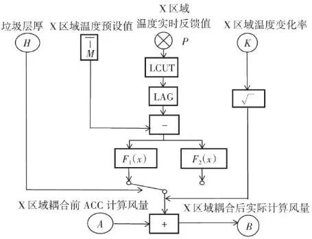ACC系統(tǒng)是以理論計算設計為基礎,以鍋爐主蒸汽流量為核心控制目標,以垃圾料層厚度、一次風系統(tǒng)母管壓力、爐排下各風室一次風流量、燃燒和燃燼爐排上部溫度(熱灼減率)、氧氣濃度等參數(shù)為次要控制目標,以垃圾熱值和占比動態(tài)測量為給料量核算依據(jù),通過改變給料量和供風量的手段,來實現(xiàn)運行人員的極少干預。其中供風量的調(diào)整,主要閉環(huán)調(diào)節(jié)是以主蒸汽量的變化為最高權重。而溫度控制(燃燒和燃燼段上部熱電偶溫度變化值)作為輔助的閉環(huán)調(diào)節(jié)之一,權重占比較輕,約占5%~10%。