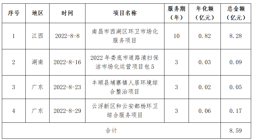 其中最典型的就是山東省德州市寧津縣城鄉(xiāng)環(huán)衛(wèi)一體化及綠化提升項(xiàng)目,該項(xiàng)目服務(wù)期為20年,第一至第二年合同額預(yù)估為5682萬元,第三至二十年合同額預(yù)估為13.4514億元,合計金額14.0196億元。項(xiàng)目服務(wù)范圍包括但不限于寧津縣10座鄉(xiāng)鎮(zhèn)垃圾轉(zhuǎn)運(yùn)站的升級改造以及新建鄉(xiāng)鎮(zhèn)生活垃圾分類處理項(xiàng)目,鄉(xiāng)鎮(zhèn)駐地及國省干道綠化提升工程以及縣城綠化提升工程(包括福寧河公園提升改造、道路綠化及小游園提升改造、康寧湖提升改造工程)及其他環(huán)衛(wèi)服務(wù)。據(jù)環(huán)衛(wèi)科技網(wǎng)粗略統(tǒng)計,北控城市環(huán)境今年已中標(biāo)近20個環(huán)衛(wèi)項(xiàng)目,合計中標(biāo)金額超過48億元。在年度排行榜上,目前僅次于盈峰環(huán)境和僑銀股份,排在第三的位置。進(jìn)入2022年,盈峰環(huán)境和僑銀股份兩家環(huán)衛(wèi)龍頭企業(yè)延續(xù)了以往的強(qiáng)勢,幾乎每個月度排行都榜上有名。8月,盈峰環(huán)境和僑銀股份再次上榜,分別排在第5和第7的位置。盈峰環(huán)境當(dāng)月中標(biāo)6個環(huán)衛(wèi)項(xiàng)目,尤其在最后一天同時拿下遼寧省海城市鐵西環(huán)衛(wèi)一體化和江西省南豐縣城區(qū)環(huán)衛(wèi)清掃保潔兩個特許經(jīng)營項(xiàng)目,南北“雙響”收獲5.36億元。表3 盈峰環(huán)境8月中標(biāo)項(xiàng)目匯總