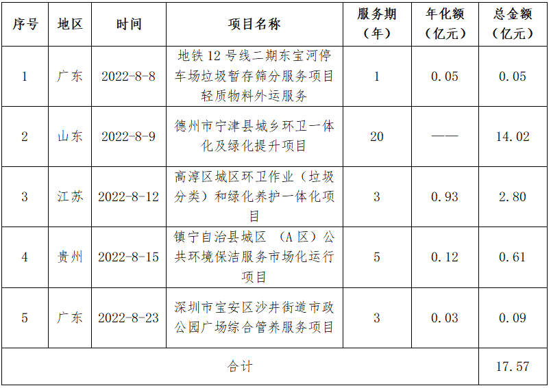 8月,河北昌潤達(dá)環(huán)境工程有限公司憑借19.36億元的定州市城區(qū)環(huán)境衛(wèi)生市場化服務(wù)項(xiàng)目登頂企業(yè)月度排行榜榜首。定州市城區(qū)環(huán)境衛(wèi)生市場化服務(wù)項(xiàng)目特許經(jīng)營期12年。服務(wù)范圍為河北省定州市市區(qū)西城、北城、南城、長安辦、經(jīng)濟(jì)開發(fā)區(qū)及高速高鐵站主次干道、小街巷、商業(yè)街區(qū)、便民市場和市區(qū)水域,清掃保潔總面積9617672.66平方米,項(xiàng)目負(fù)責(zé)公共區(qū)域生活垃圾(不含物業(yè)小區(qū)其他垃圾)產(chǎn)生量每天200~260噸。昌潤達(dá)以1.61億元/年的投標(biāo)報價位中標(biāo)該項(xiàng)目。昌潤達(dá)成立于2014年8月,位于保定市國家大學(xué)科技園8號樓,是河北省首批成立的一家集垃圾分類、城鄉(xiāng)環(huán)衛(wèi)一體化、公用設(shè)施管理維護(hù)、農(nóng)村廁改與吸污處理、智慧環(huán)衛(wèi)等多位一體的科技型環(huán)衛(wèi)一體化大型集團(tuán),系中國清潔服務(wù)行業(yè)百強(qiáng)企業(yè)。昌潤達(dá)是一家典型的立足本土的環(huán)衛(wèi)企業(yè),其服務(wù)區(qū)域主要集中在保定市及周邊縣、區(qū)和邯鄲市部分縣鄉(xiāng)村。2021年8月,知名物企佳兆業(yè)美好曾宣布擬以3.67億元的價格收購昌潤達(dá)70%的股權(quán),但最終因“公司經(jīng)營策略調(diào)整”,交易在年底告吹。從今年中標(biāo)的項(xiàng)目來看,昌潤達(dá)似乎還沒有準(zhǔn)備走出河北,依舊在深耕自己的“一畝三分地”。● 北控城市環(huán)境連下五城,全年項(xiàng)目金額超48億元8月,北控城市環(huán)境迎來一波拿標(biāo)高潮,連續(xù)中標(biāo)5個環(huán)衛(wèi)項(xiàng)目,合計中標(biāo)金額達(dá)17.57億元,一舉拿下榜眼位置。表2 北控城市環(huán)境8月中標(biāo)項(xiàng)目匯總