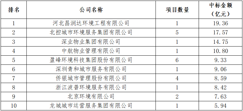 8月,竟有6企業(yè)憑中標(biāo)1項(xiàng)目進(jìn)入前十,其中昌潤達(dá)、深業(yè)物業(yè)更是憑1項(xiàng)目而排名前三。8月份企業(yè)排名如表1所示。表1 8月環(huán)衛(wèi)項(xiàng)目中標(biāo)企業(yè)排行榜