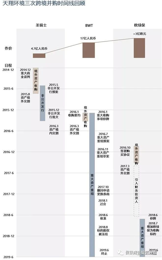原本的十大并購案例,寫著寫著寫成了十大環(huán)保并購慘案。為了緩解大家失落悵惘的心情,免費(fèi)奉上一個(gè)跌到谷底的案子,大家再忍一忍,黎明前的黑暗。本文為環(huán)保十大并購案例之五,天翔環(huán)境海外收購圣騎士、BWT、歐綠保,最終公司破產(chǎn)退市。我們之前看的幾個(gè)并購失敗案例,雖然也都是十年苦心經(jīng)營,毀于一旦,但大部分只是元?dú)獯髠?,主營業(yè)務(wù)利潤虧光,大股東黯然離場而已。今天的案例,并購的后果是上市公司破產(chǎn)退市,大股東債務(wù)纏身被檢查機(jī)關(guān)起訴,員工債權(quán)人均蒙受巨大損失。里里外外大幾十億的虧損,堪稱“環(huán)保上市公司十年內(nèi)最大的慘案”。歡迎大家多提寶貴意見。尋找底層規(guī)律,帶動(dòng)行業(yè)發(fā)展,避免低級(jí)錯(cuò)誤重現(xiàn)。幾經(jīng)掙扎的天翔環(huán)境最終還是在2021年8月30日迎來了被深交所摘牌的結(jié)局。天翔環(huán)境原名天保重裝,原主業(yè)為大型節(jié)能環(huán)保及清潔能源設(shè)備,具體包括分離機(jī)械系列設(shè)備和水輪發(fā)電機(jī)組設(shè)備,并于2014年完成上市。當(dāng)時(shí),天翔環(huán)境的主營已露疲態(tài),上市當(dāng)年收入下滑超過30%,公司開始尋找轉(zhuǎn)型方向。2015年開始,天翔環(huán)境通過連續(xù)的大手筆并購進(jìn)軍環(huán)保領(lǐng)域,先后以4.7億收購美國的污泥處理設(shè)備公司圣騎士、17億收購德國的水處理公司BWT,并在隨后迎來了自己的高光時(shí)刻,2016年底,其市值來到了107.5億的歷史最高值。好景不長,因?yàn)轶w外并購未能裝入上市公司,導(dǎo)致了一系列問題,悲劇大幕就此拉開。2018年,天翔環(huán)境在年報(bào)中披露,控股股東直接控制的成都親華科技有限公司非經(jīng)營性資金占用24.55億,而當(dāng)時(shí)天翔環(huán)境本身的債務(wù)逾期金額已達(dá)到17.58億。從此,天翔環(huán)境股價(jià)持續(xù)下跌,直至2021年8月30日最終被深交所摘牌。回顧天翔環(huán)境的發(fā)展歷程,核心是三次海外收購,分別是2014年12月收購的美國圣騎士,2016年1月收購的BWT公司,2016年10月收購的歐綠保,交易金額預(yù)期超過3億歐元。其中第一個(gè)交易順利完成,后面兩個(gè)交易只完成了體外收購,并沒有完成裝入上市公司的動(dòng)作,最終也導(dǎo)致了上市公司與大股東的相繼崩盤。第一筆收購,公司與券商聯(lián)合成立基金,收購標(biāo)的公司。然后上市公司非定向增發(fā),募集資金收購基金持股。收購與定增并行推進(jìn),加快交易節(jié)奏,順利地完成了交易。這個(gè)案子金額相對(duì)小,方案謹(jǐn)慎,交易結(jié)構(gòu)簡單,資本市場當(dāng)時(shí)資金充足,因此完成相對(duì)容易些。企業(yè)由此嘗到了甜頭,默認(rèn)為其他項(xiàng)目也可以先收購,再定增裝入上市公司。2016年2月,僅僅在上市公司剛剛完成非公開發(fā)行一個(gè)月、圣騎士股權(quán)尚未完成交割之時(shí),天翔環(huán)境又再次啟動(dòng)了對(duì)更大的收購標(biāo)的——估值達(dá)到2.2億歐元的德國水處理公司BWT。因?yàn)榻灰讜r(shí)間緊張,天翔和基金先籌集資金收購,然后再由大股東組建資金替代基金,大股東向其他人承諾兜底,最終由上市公司定增完成收購。在當(dāng)時(shí)的背景下,是有很多基金愿意參與并購定增,同時(shí)也默認(rèn)定增即可賺錢的邏輯,愿意參與這種有一定風(fēng)險(xiǎn)的投資。基金的收益在于定增后的股價(jià)增值,以及定增不成的大股東保底,風(fēng)險(xiǎn)在于定增后股價(jià)下跌,定增失敗后大股東無法保底。當(dāng)時(shí)環(huán)境下,基金方總體上還是認(rèn)為風(fēng)險(xiǎn)收益匹配的。這種情況跟當(dāng)時(shí)的熱錢有關(guān),即大部分資金來自信托,錢多無處可投。當(dāng)時(shí)的資金投資邏輯并不穩(wěn)定,是一種特殊情況。但第二筆收購出現(xiàn)了問題,監(jiān)管機(jī)構(gòu)審核達(dá)2年之久。兩個(gè)原因,一個(gè)是券商的原因,一個(gè)是資金的來源問題。最終獲得批文的時(shí)間已經(jīng)是2018年6月。雪上加霜的是,公司在這筆交易尚未完成之際,大股東又組團(tuán)以3億歐元的價(jià)格收購了更大的一家歐洲垃圾處理公司,同樣無法完成交易。這個(gè)時(shí)候大股東和上市公司都扛不住了,體外并購的杠桿利息,疊加當(dāng)時(shí)嚴(yán)厲“去杠桿”的外部環(huán)境以及上市公司的PPP業(yè)務(wù)占用大量資金無法回收,跌跌不休的股價(jià)最終帶崩了大股東以及上市公司的債務(wù)崩盤。2018年8月,大股東企業(yè)親華科技持有中德天翔20.59%的股份被債權(quán)人凍結(jié),導(dǎo)致上市公司收購中德天翔的交易無法完成交割。2019年1月24日上市公司公告收到證監(jiān)會(huì)立案調(diào)查通知書,此時(shí)天翔環(huán)境大股東因債務(wù)危機(jī)侵占上市公司資金已經(jīng)公開。2019年6月19日,天翔環(huán)境公告終止收購中德天翔以及歐綠保的交易,大股東的過橋基金退出失敗,天翔環(huán)境開始自由解體。公司2021年年報(bào)披露,在2020年8月收到鄧親華及一致行動(dòng)人鄧翔提供的成都市公安局出具 的《取保候?qū)彌Q定書》,2021年1月19日,公司、鄧親華、鄧翔被移送成都市人民檢察院審查起訴。整個(gè)故事中,公眾號(hào)“文藝馥欣”做了精