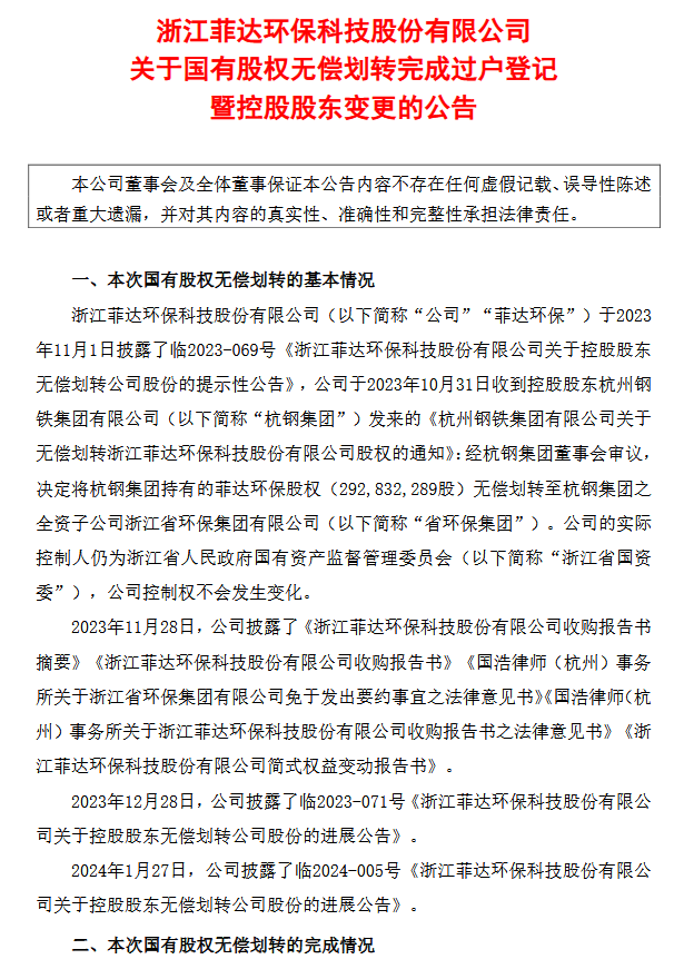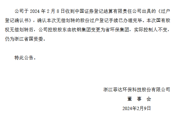 菲達(dá)環(huán)保發(fā)布公告稱,2024年2月8日收到中國(guó)證券登記結(jié)算有限責(zé)任公司出具的《過戶登記確認(rèn)書》,確認(rèn)本次無償劃轉(zhuǎn)的股份過戶登記手續(xù)已辦理完畢。