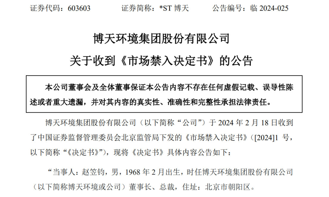 2月19日,博天環(huán)境公告稱,公司于2月18日收到北京證監(jiān)局下發(fā)的《市場禁入決定書》,認定博天環(huán)境2017年、2018年、2019年、2020年、2021年年度報告存在虛假記載,構成《證券法》所述的信息披露違法行為。