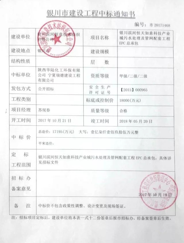 2017年10月19月,華陸環(huán)保憑借著豐富的行業(yè)經(jīng)驗、良好的市場信譽(yù)、優(yōu)秀的設(shè)計團(tuán)隊、完善的服務(wù)體系以及專業(yè)的投標(biāo)方案,成功中標(biāo)銀川濱河恒天如意科技產(chǎn)業(yè)城污水處理及管網(wǎng)配套工程EPC總承包項目(以下簡稱:中標(biāo)項目),中標(biāo)金額為1.7195億元。
