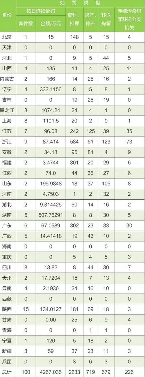 1-9月,全國實(shí)施五類案件總數(shù)28708件。同比去年1-9月增長146%。其中,按日連續(xù)處罰案件822件,比去年增長57%。罰款金額達(dá)96057.6萬元,比去年增長73%;查封、扣押案件13115件,比去年增長156%;限產(chǎn)、停產(chǎn)案件6420件,比去年增長170%;移送行政拘留6278起,比去年增長172%;移送涉嫌環(huán)境污染犯罪案件2073件,比去年增長53%。