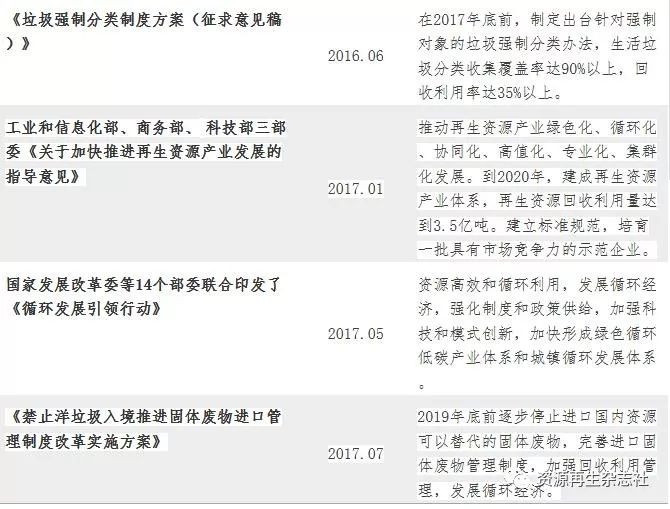 在2017年5月國(guó)家發(fā)展改革委等14個(gè)部委聯(lián)合印發(fā)的《循環(huán)發(fā)展引領(lǐng)行動(dòng)》中,我國(guó)提出到2020年,整體資源循環(huán)利用產(chǎn)業(yè)產(chǎn)值要達(dá)到3萬(wàn)億左右的目標(biāo)。這對(duì)于再生資源回收市場(chǎng)來(lái)說(shuō)是一個(gè)明確的導(dǎo)向,更是積極的信號(hào)。