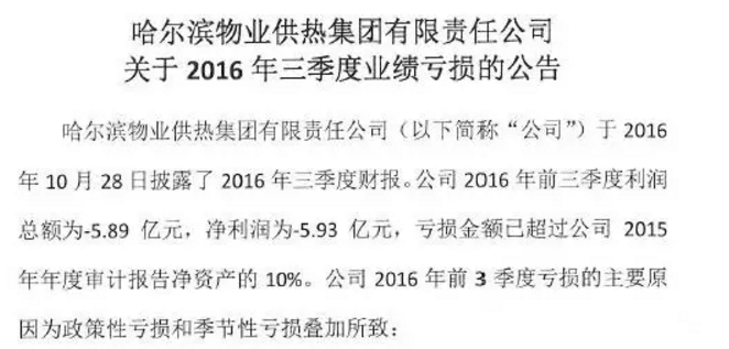 2016年前三季度,哈爾濱物業(yè)供熱集團有限公司虧損5.89億元,虧損金額超過其2015年年度審計報告凈資產(chǎn)的10%。該公司曾披露,在供熱質(zhì)量和環(huán)保排放質(zhì)量提升的情況下,熱費價格卻隨煤炭價格走低而下調(diào),政策性虧損為其2016年前三季度虧損主要原因。
