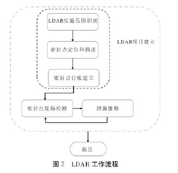 美國《石化企業(yè)泄漏檢測與修復(fù)工作指南》將LDAR工作流程劃分為LDAR項(xiàng)目建立、現(xiàn)場檢測和泄漏維修3個步驟,對其進(jìn)行進(jìn)一步拆解,可將LDAR工作流程劃分為LDAR實(shí)施范圍識別、密封點(diǎn)定位和描述、密封點(diǎn)臺賬建立、密封點(diǎn)現(xiàn)場檢測、泄漏點(diǎn)維修、出具報告6個步驟,如圖2所示。