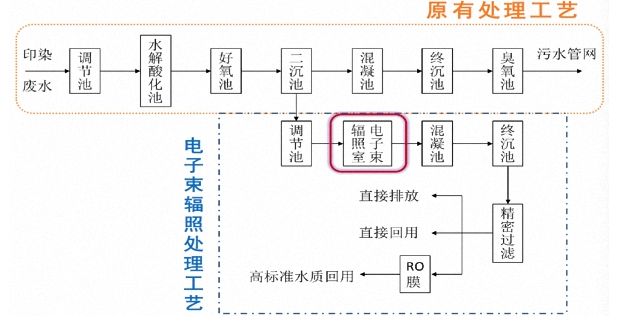 印染廢水具有污染物濃度高、種類多、含有毒有害成分及色度高等特點(diǎn),利用加速后的電子束流對(duì)污水進(jìn)行輻照,可以使水中的污染物發(fā)生分解或降解、有害微生物發(fā)生變性等,從而達(dá)到消毒凈化廢水的目的。