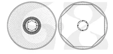 碟管式反滲透(DTRO)是一種獨(dú)特的膜分離設(shè)備。碟管式膜組件采用開放式流道,DT組件兩導(dǎo)流盤直接距離為4mm,盤片表面有一定方式排列的凸點(diǎn)。DTRO凸點(diǎn)導(dǎo)流盤與膜片如圖所示