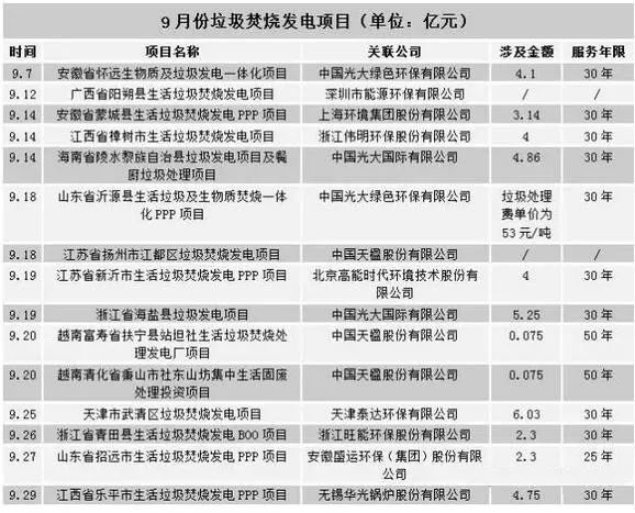 不僅如此,曾經(jīng)一周內(nèi)就有4個(gè)垃圾焚燒發(fā)電項(xiàng)目簽約成功。9月13日,上海環(huán)境公告稱,簽訂了蒙城縣垃圾焚燒發(fā)電PPP項(xiàng)目;9月14日,光大國際中標(biāo)海南陵水縣垃圾發(fā)電項(xiàng)目;9月15日,偉明環(huán)保表示,公司已經(jīng)拿下樟樹市生活垃圾焚燒項(xiàng)目建設(shè)運(yùn)營標(biāo)的;9月19日,光大國際再奪浙江海鹽垃圾發(fā)電項(xiàng)目。