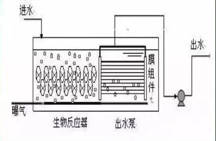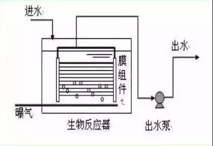 把膜組件置于生物反應(yīng)器內(nèi)部。進水進入膜--生物反應(yīng)器,其中的大部分污染物被混合液中的活性污泥去除,再在外壓作用下由膜過濾出水。