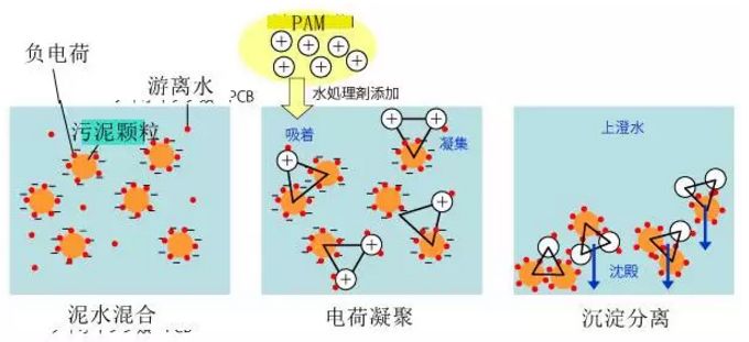 從上圖可以看到,生活污水處理廠的污泥中的污泥顆粒帶有負電荷(工業(yè)廢水中污泥顆粒會攜帶正電荷),在水中發(fā)生同性相斥作用,導(dǎo)致污泥無法凝聚到一起,在投入陽離子的PAM藥劑以后,PAM藥劑帶有與污泥顆粒攜帶的電荷相反的電荷,通過這些電荷的異性相吸作用,把污泥顆粒吸附凝集到一起,把成懸浮狀態(tài)的污泥顆粒變成更大體積的污泥顆粒,這些依靠化學(xué)作用凝聚到一起的污泥顆粒由于比重遠遠大于水,所以很容易在水中沉淀下來。
