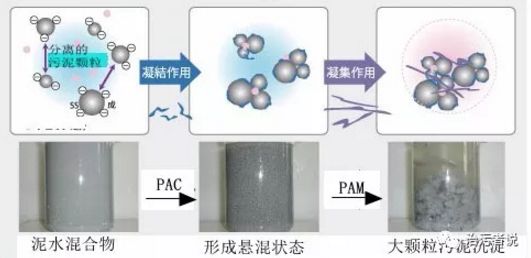 那么什么樣的化學(xué)藥劑可以作用到污泥中這些因素,并能夠?qū)崿F(xiàn)污泥中水分的去除呢?我們來了解一種化學(xué)藥劑,學(xué)名為聚丙烯酰胺,化學(xué)名稱的縮寫為PAM。PAM作為一種聚合藥劑,在水處理中的應(yīng)用廣泛,主要是對泥水混合物進行有效的固液分離,從而實現(xiàn)污泥脫水的化學(xué)凝聚作用。對于PAM的制作和特性,在很多文獻中都有,不作為今天主要討論的內(nèi)容。今天就是來看PAM是怎樣實現(xiàn)對泥水混合物的固液分離的,我們來看看這一張圖。