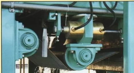 在脫水機(jī)的濾帶兩側(cè),各裝有一個(gè)限位開關(guān),和濾帶保持一定的距離,在濾帶碰觸到限位開關(guān)以后,限位開關(guān)給糾偏氣缸的空氣電動閥一個(gè)開啟信號,糾偏氣缸開始動作,推動糾偏輥?zhàn)?,濾帶在糾偏輥?zhàn)拥膸酉拢貧w到正常的位置,完成一次完整的糾偏。帶式壓濾脫水機(jī)在運(yùn)行中,不斷的進(jìn)行糾偏動作,對跑偏的濾帶進(jìn)行糾偏,從而保證了帶式壓濾機(jī)的正常穩(wěn)定的運(yùn)行。