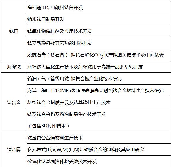重點(diǎn)開發(fā):高檔鈦白、納米二氧化鈦、鈦粉(3D打印材料)、鈦及鈦合金材、鈦基復(fù)合材料(如鈦-鋼鐵復(fù)合材料、鈦-無機(jī)非金屬材料)、鈦功能材料(如鈦催化材料)、鈦鋁基多元合金材料(如摻稀土的鈦鋁合金材料)。艦船結(jié)構(gòu)、海水淡化用鈦板/管,石油工程用鈦油井管、耐蝕集輸管,汽車發(fā)動(dòng)機(jī)用鈦鋁合金,煉化、化工用鈦及鈦鋼復(fù)合板/管。