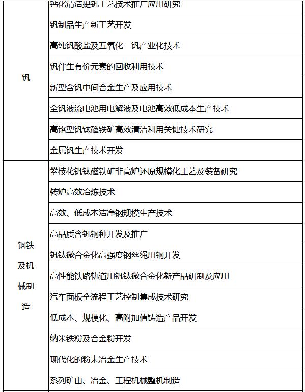 3.科技攻關(guān)自主創(chuàng)新目標(biāo):重點(diǎn)突破攀西礦制取富鈦料、氯化法鈦白、低品位礦高效利用、非高爐冶煉等一批核心關(guān)鍵技術(shù),實(shí)現(xiàn)氧化釩清潔生產(chǎn)工藝、釩電池、高鈦型高爐渣回收利用等新技術(shù)產(chǎn)業(yè)化應(yīng)用。