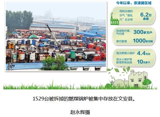 11月21日,京津冀及周邊地區(qū)“散亂污”企業(yè)治理暨秋冬季大氣污染綜合治理攻堅(jiān)階段總結(jié)現(xiàn)場(chǎng)會(huì)在文安舉行。環(huán)保部部長(zhǎng)李干杰通報(bào),今年以來(lái),京津冀區(qū)域6.2萬(wàn)余家涉氣“散亂污”企業(yè)得到治理;完成電代煤、氣代煤300多萬(wàn)戶,替代散煤1000多萬(wàn)噸;淘汰燃煤小鍋爐4.4萬(wàn)臺(tái),淘汰小煤爐等散煤燃燒設(shè)施10萬(wàn)多個(gè)……