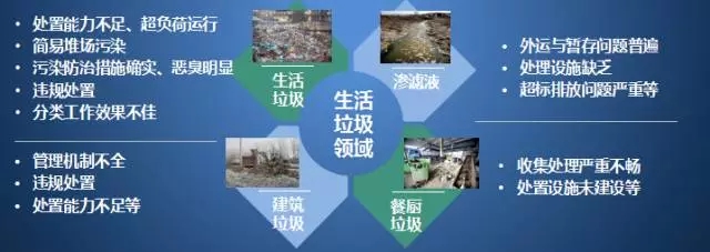 2016.1.4至2017.5.28三批中央環(huán)保督察工作中暴露了環(huán)衛(wèi)領(lǐng)域存在問題:生活垃圾處理設(shè)施不足/違規(guī)處置/隨意傾倒嚴重、簡易垃圾填埋場存在、滲濾液偷排或超標排放嚴重、建筑垃圾管理不善、生活垃圾分類工作滯后和臭氣擾民等。