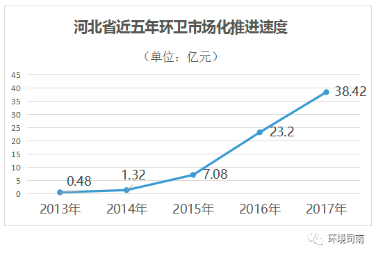 2013年河北省全省的環(huán)衛(wèi)市場化規(guī)模不足5000萬元,2014年也僅有1.32億元。進入2015年后,在國家層面的政策利好頻頻出臺的基礎(chǔ)上,河北省連續(xù)三年出臺相關(guān)政策措施,環(huán)衛(wèi)市場化規(guī)模呈現(xiàn)出爆發(fā)式增長態(tài)勢。2015年市場規(guī)模直接由1.32億跳升到7.08億,2016年拉升到23.2億,2017年繼續(xù)保持強勁增勢,截止11月30日,2017年度市場化規(guī)模已接近40億元。