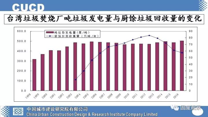 下面這張圖可以看出臺(tái)灣地區(qū)的廚余回收量的變化對(duì)焚燒發(fā)電效率的影響基本沒(méi)有。臺(tái)灣地區(qū)雖然聲稱廚余垃圾分類收集做得好,但廚余垃圾的回收利用要明顯落后,臺(tái)灣第一個(gè)廚余垃圾厭氧處理廠今年才動(dòng)工,計(jì)劃2018年底才能投入運(yùn)營(yíng)。