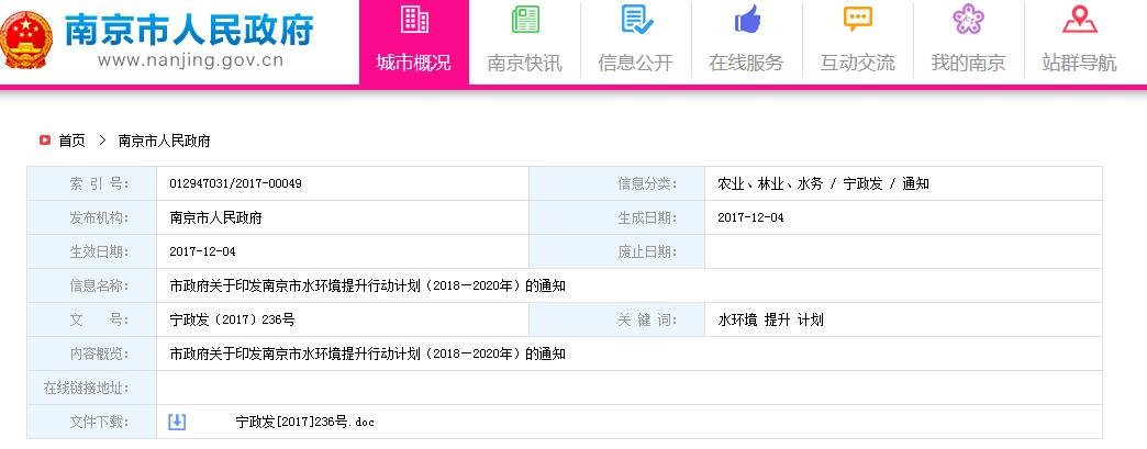 市政府關(guān)于印發(fā)南京市水環(huán)境提升行動計(jì)劃(2018—2020年)的通知