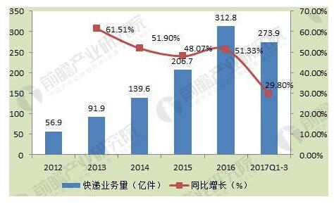 圖表3:2012-2017年前三季度中國(guó)快遞業(yè)務(wù)量走勢(shì)(單位:件,%)