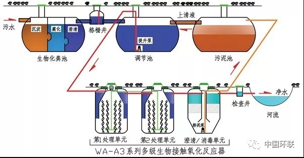 工藝流程:農村生活污水流經化糞池沉淀,格柵井去雜質后進入“多級生物接觸氧化反應器”進過氧化、沉淀、深度澄清處理后達標排放。