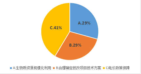 調(diào)查結(jié)果顯示,41%的受訪者認為保障電價政策是促進燃煤生物耦合發(fā)電技改試點工作的最佳方式。認為生物質(zhì)資源規(guī)?;煤秃侠泶_定技改項目技術(shù)方案的受訪者比例相當。