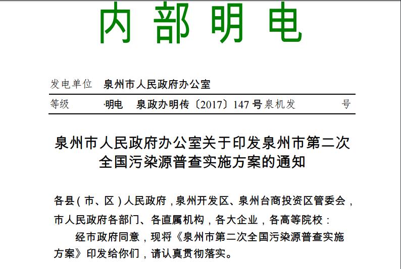 泉州市人民政府辦公室關(guān)于印發(fā)泉州市第二次全國污染源普查實施方案的通知