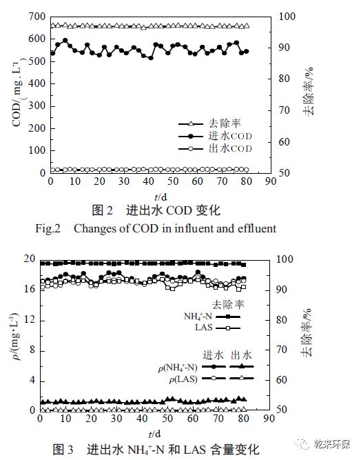 由圖3 可知,進(jìn)、出水NH4+-N 的質(zhì)量濃度分別在16.57~ 18.43、1.15~1.71 mg/L,最高、最低NH4+-N去除率分別為93.47%、90.27%;進(jìn)水LAS 的質(zhì)量濃度在16.42~17.72 mg/L,變化不大,出水LAS 含量幾乎一致,質(zhì)量濃度平均在0.19 mg/L 左右,LAS 平均去除率達(dá)到了98.89%。