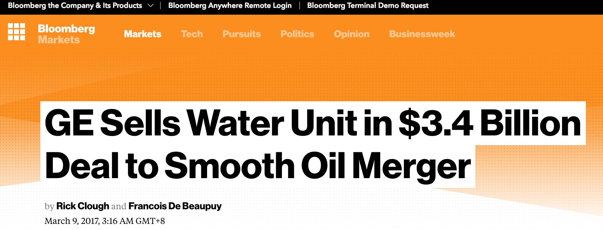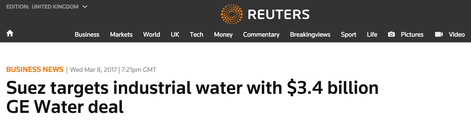 水行業(yè)巨頭法國(guó)蘇伊士環(huán)境聯(lián)合加拿大第二大養(yǎng)老金投資管理機(jī)構(gòu)—魁北克儲(chǔ)蓄投資集團(tuán)(Caisse de dép?t et placement du Québec )正式確認(rèn)收購(gòu)GE水處理。GE水處理是在2016年10月宣布出售的,之后曾出現(xiàn)過(guò)諸如威立雅、全球最大儀器公司丹納赫集團(tuán)(Danaher Corporation)、著名的私人股權(quán)投資和投資管理公司黑石集團(tuán)(Blackstone Group)等潛在買家的傳聞。 在上個(gè)月底,蘇伊士環(huán)境的新聞發(fā)言人也對(duì)外宣布正在考慮收購(gòu)GE工業(yè)水處理業(yè)務(wù)的可能性。是什么讓蘇伊士在官宣之后的半個(gè)月內(nèi)就完成這宗收購(gòu)呢?今天我們將帶大家看看全球各大媒體對(duì)這次收購(gòu)的解讀。