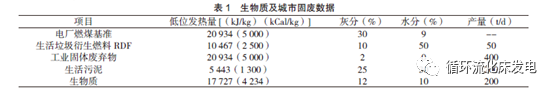 根據(jù)初步分析數(shù)據(jù),擬利用的生物質(zhì)、城市固廢(生活垃圾、工業(yè)固體廢棄物、生活污泥),其熱值及數(shù)量情況如表1所示。
